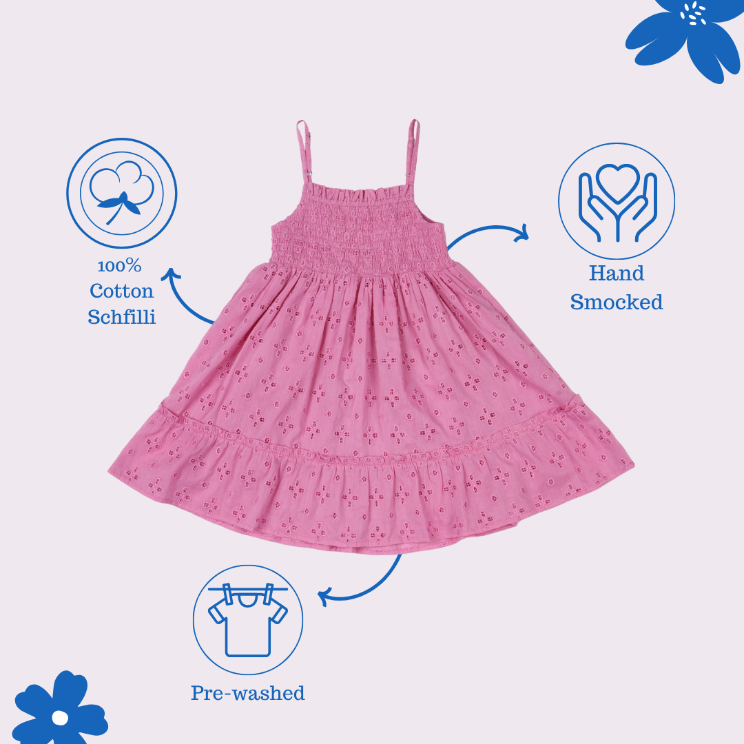 Tiered dress perfect for a summer party or everyday wear. Crafted from 100% Cotton schifil - breathable & soft. Excellent choice for the summer season. Featuring a smocked bust and adjustable straps for extra comfort. Lined with cotton for the perfect fit.