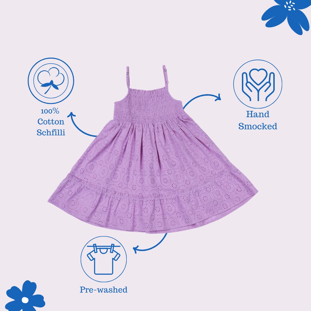 Tiered dress perfect for a summer party or everyday wear. Crafted from 100% Cotton schifil - breathable & soft. Excellent choice for the summer season. Featuring a smocked bust and adjustable straps for extra comfort. Lined with cotton for the perfect fit.